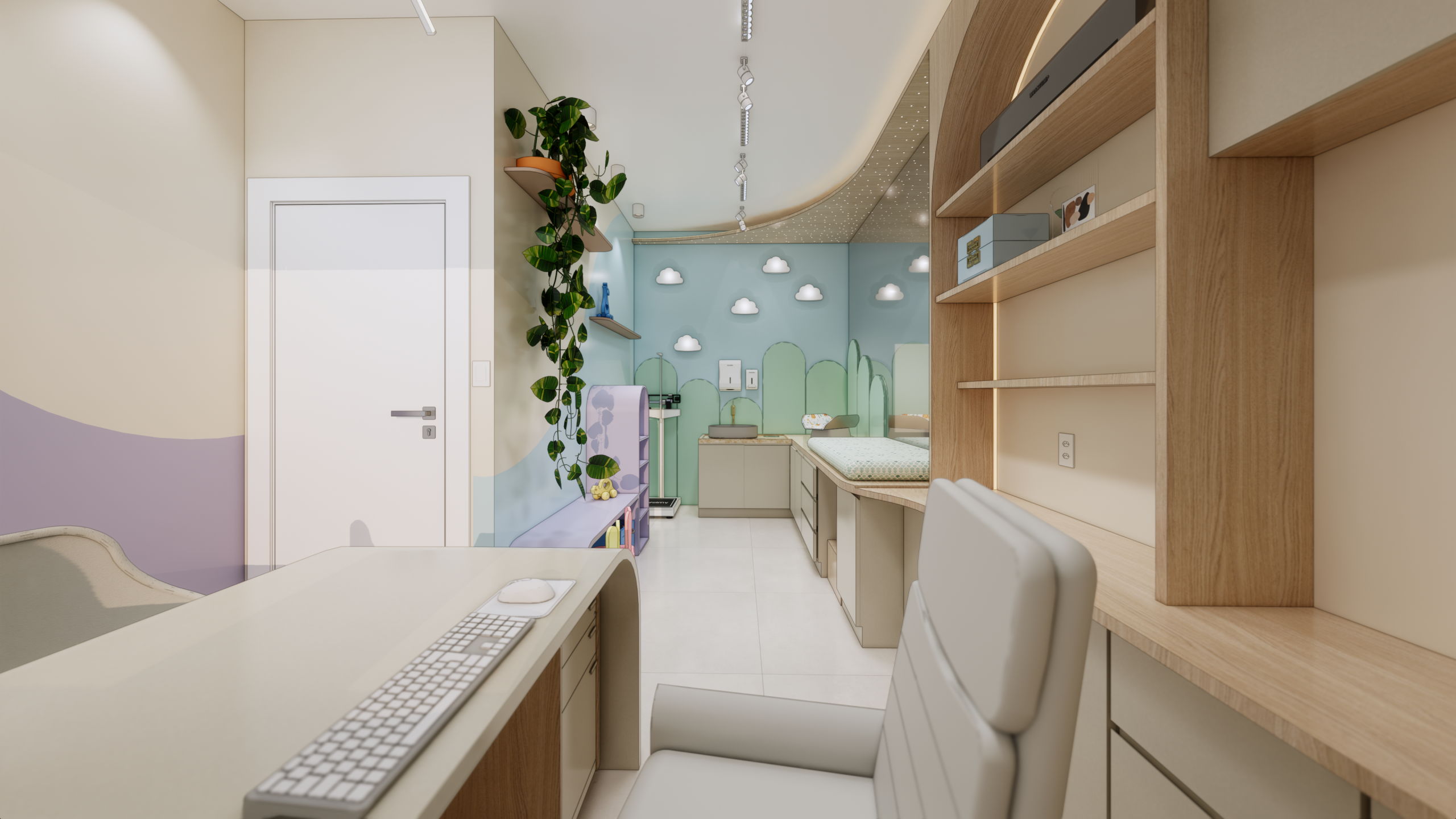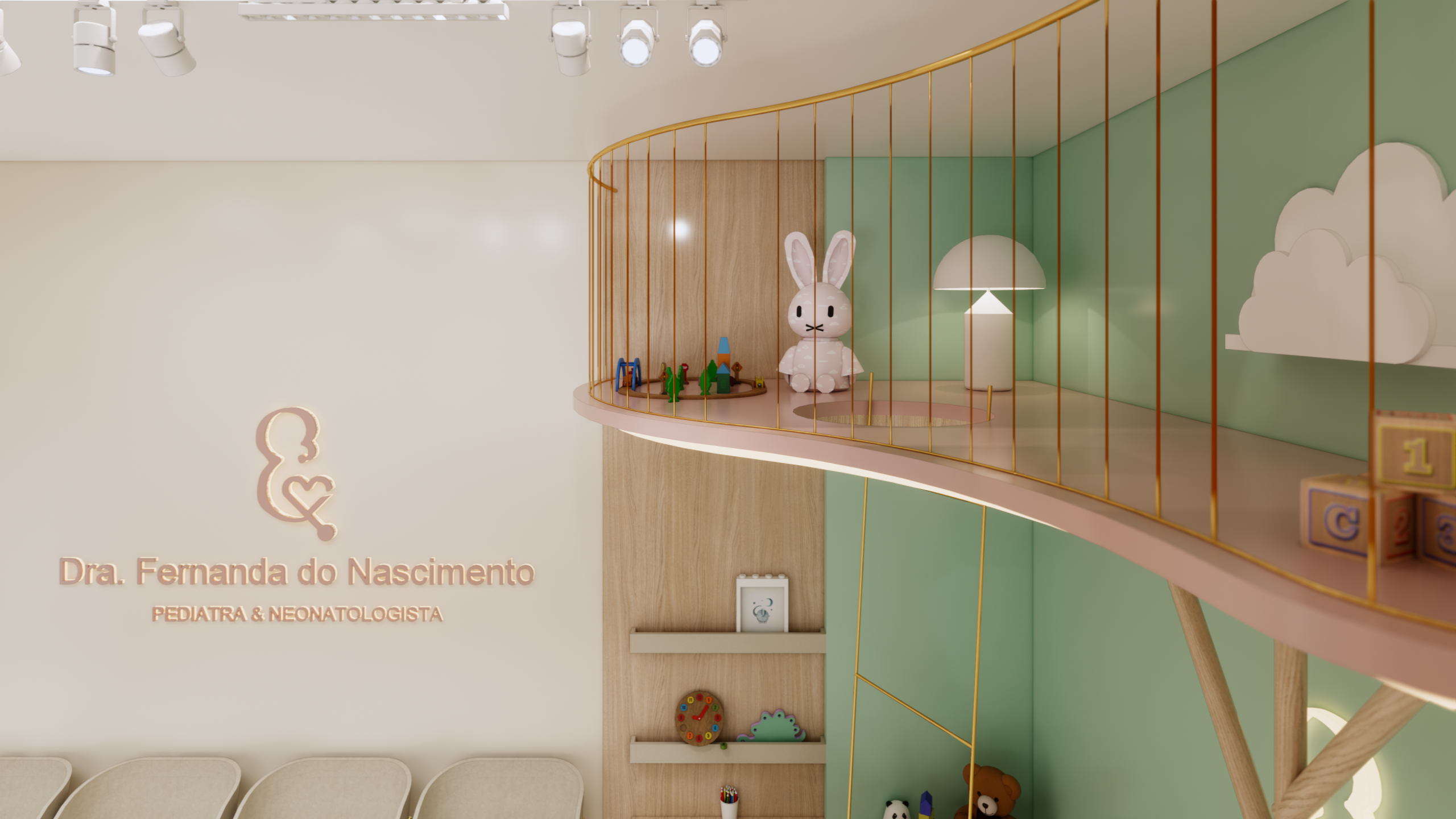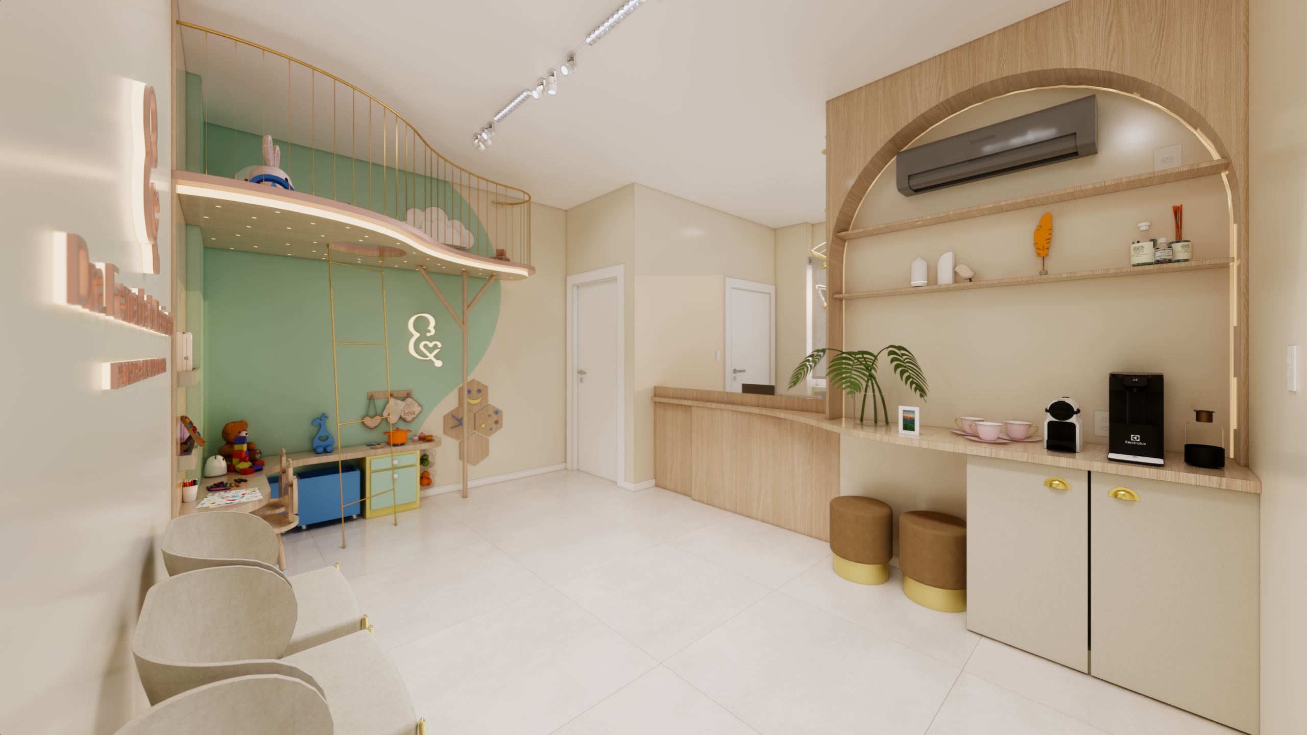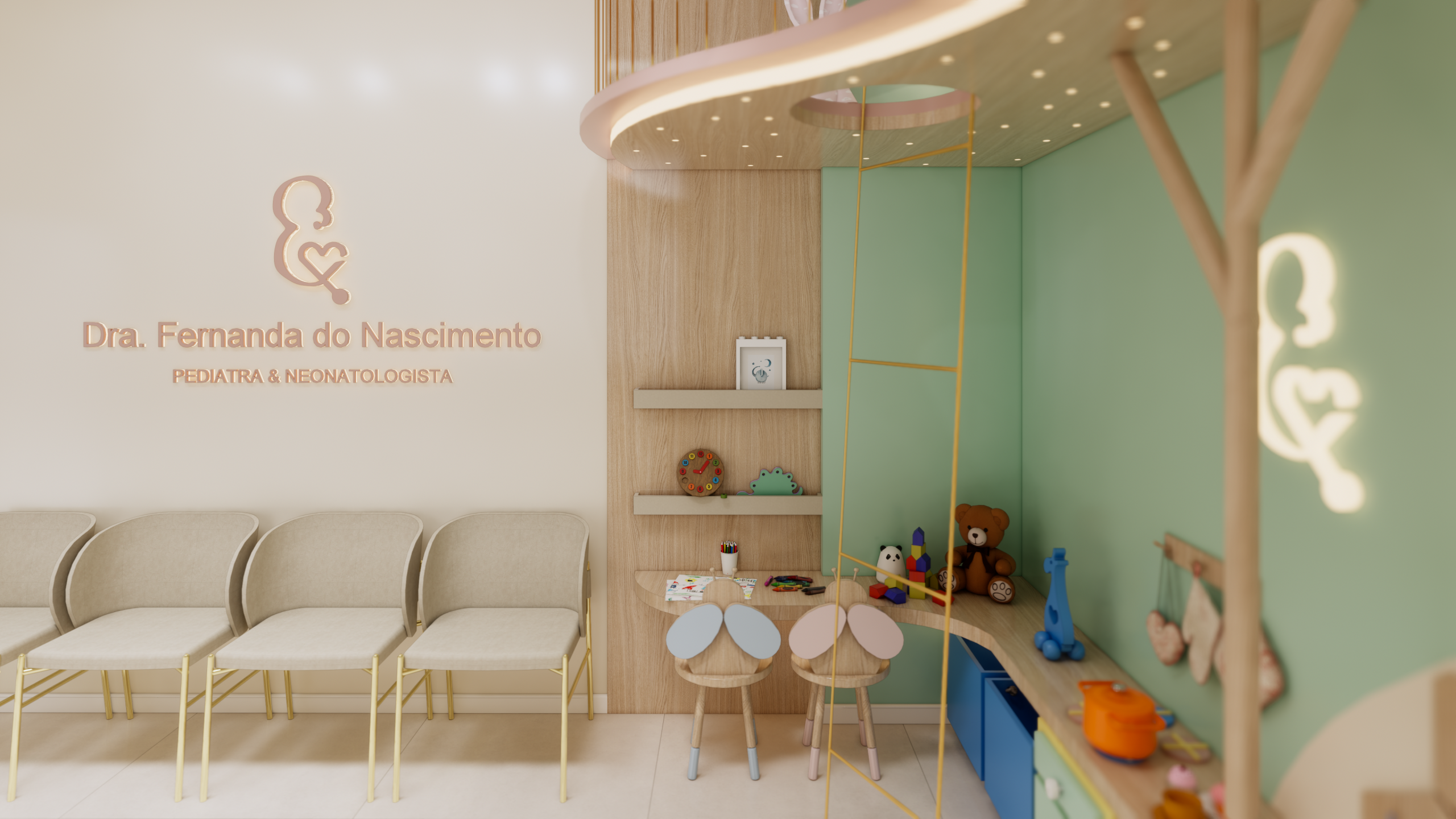 O layout do consultório foi cuidadosamente planejado para garantir praticidade e funcionalidade, sem abrir mão da estética delicada e acolhedora. Cada elemento foi escolhido com cuidado para atender às necessidades dos pequenos pacientes e de suas famílias.