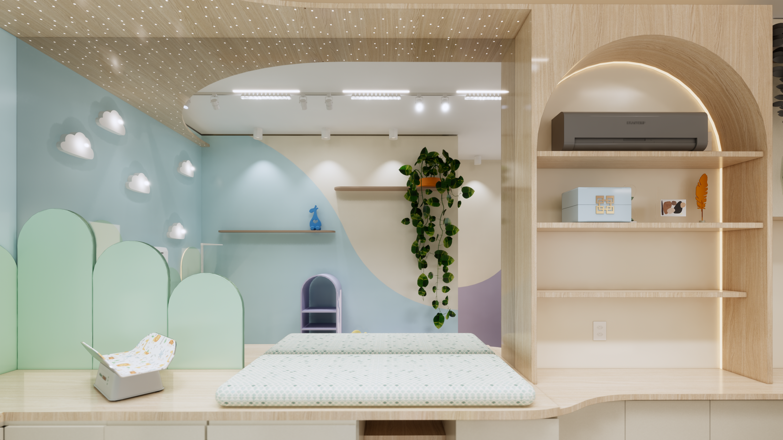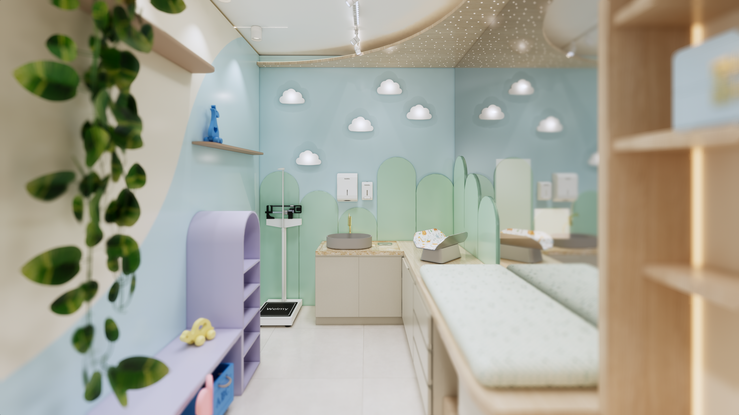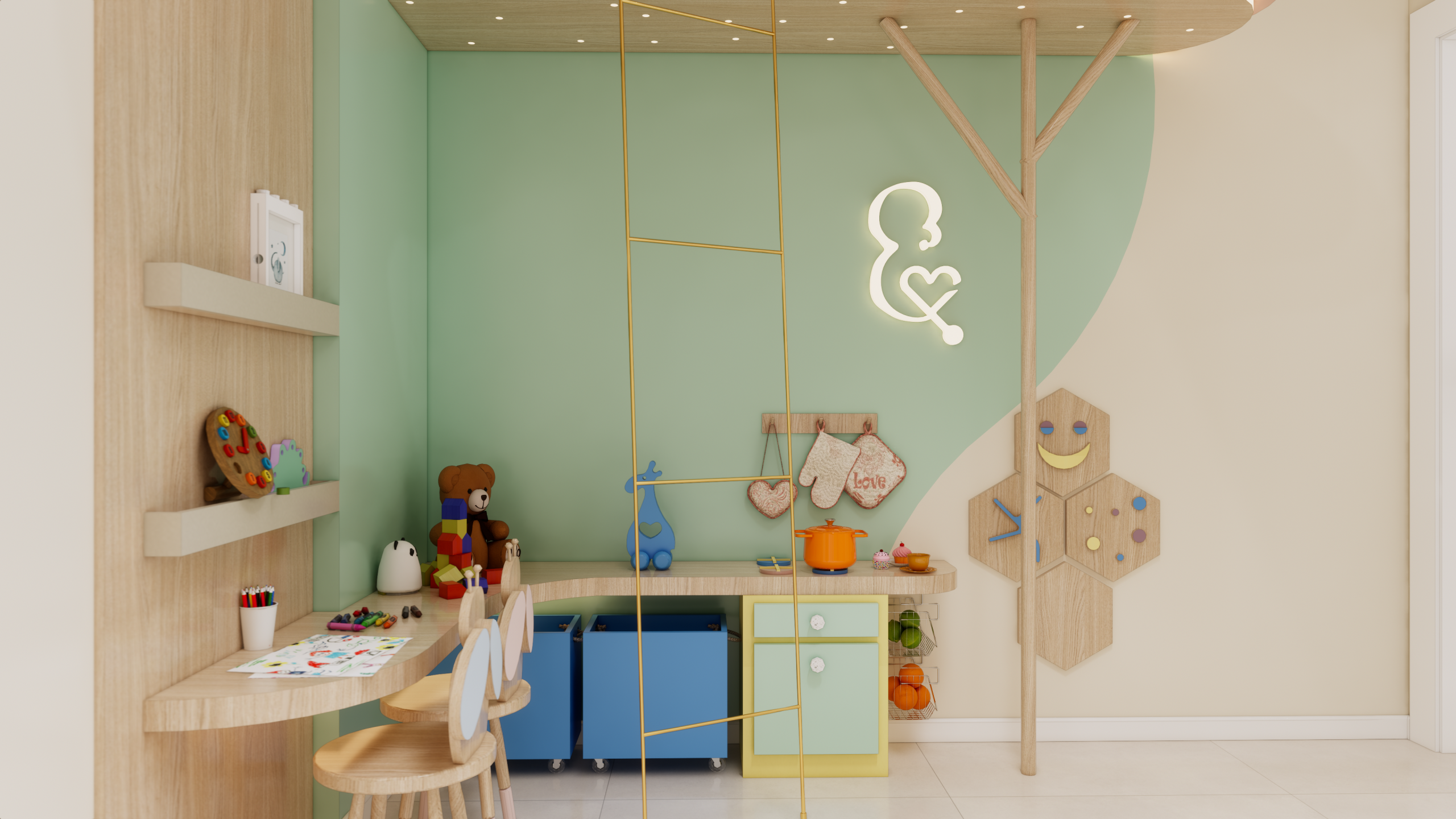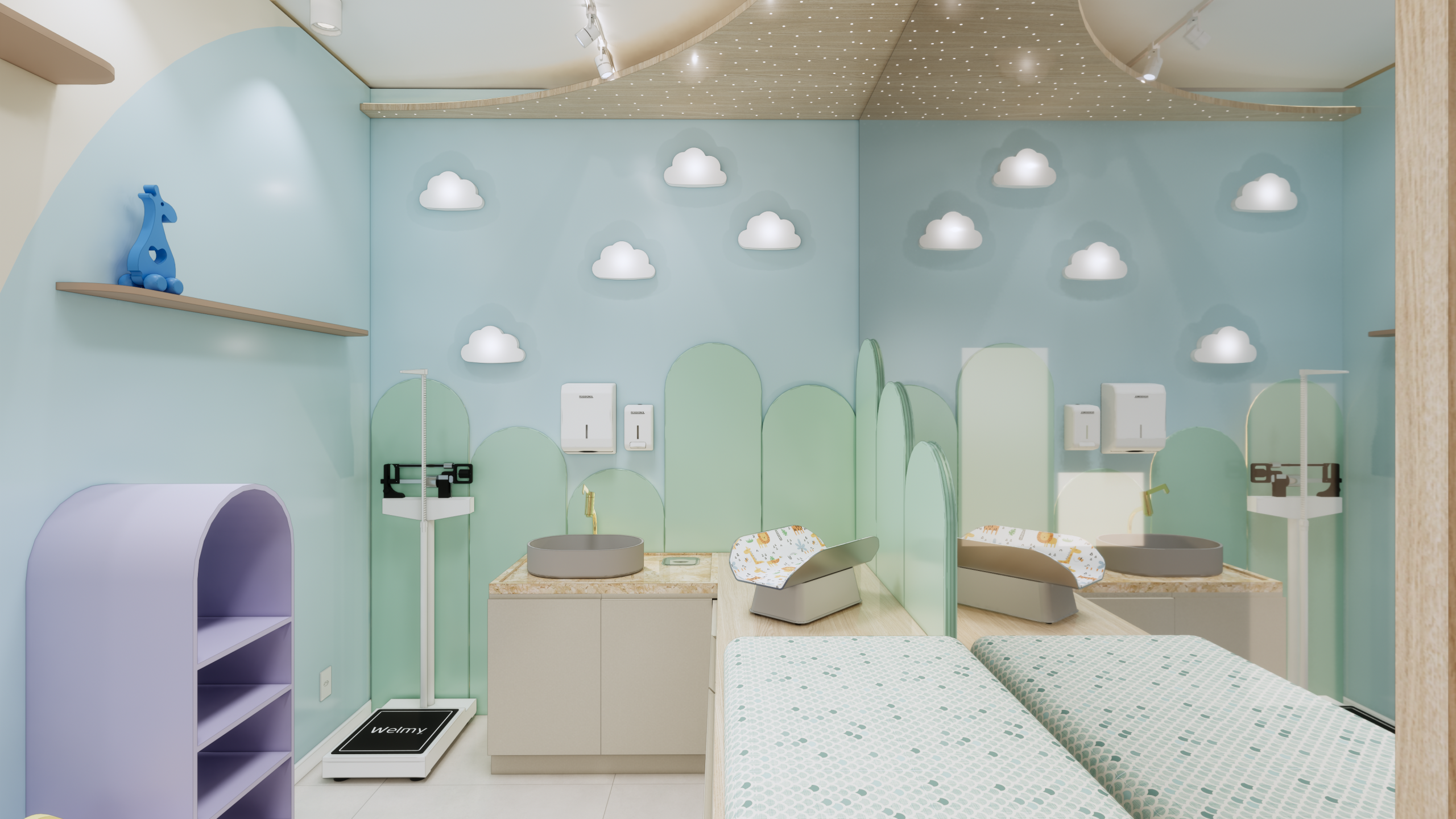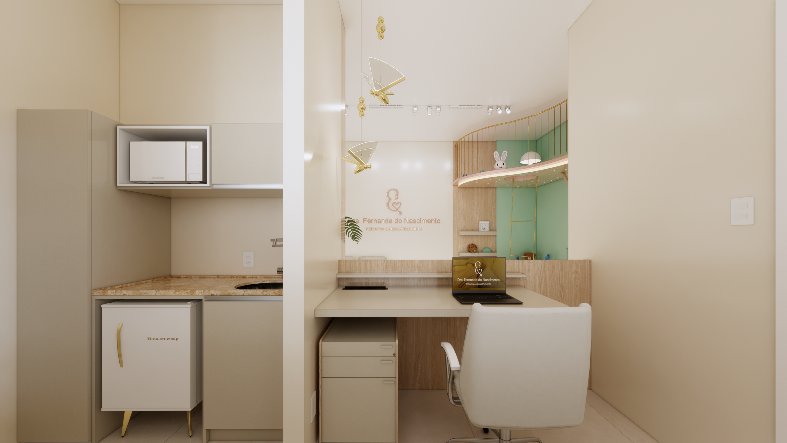 O layout do consultório foi cuidadosamente planejado para garantir praticidade e funcionalidade, sem abrir mão da estética delicada e acolhedora. Cada elemento foi escolhido com cuidado para atender às necessidades dos pequenos pacientes e de suas famílias.