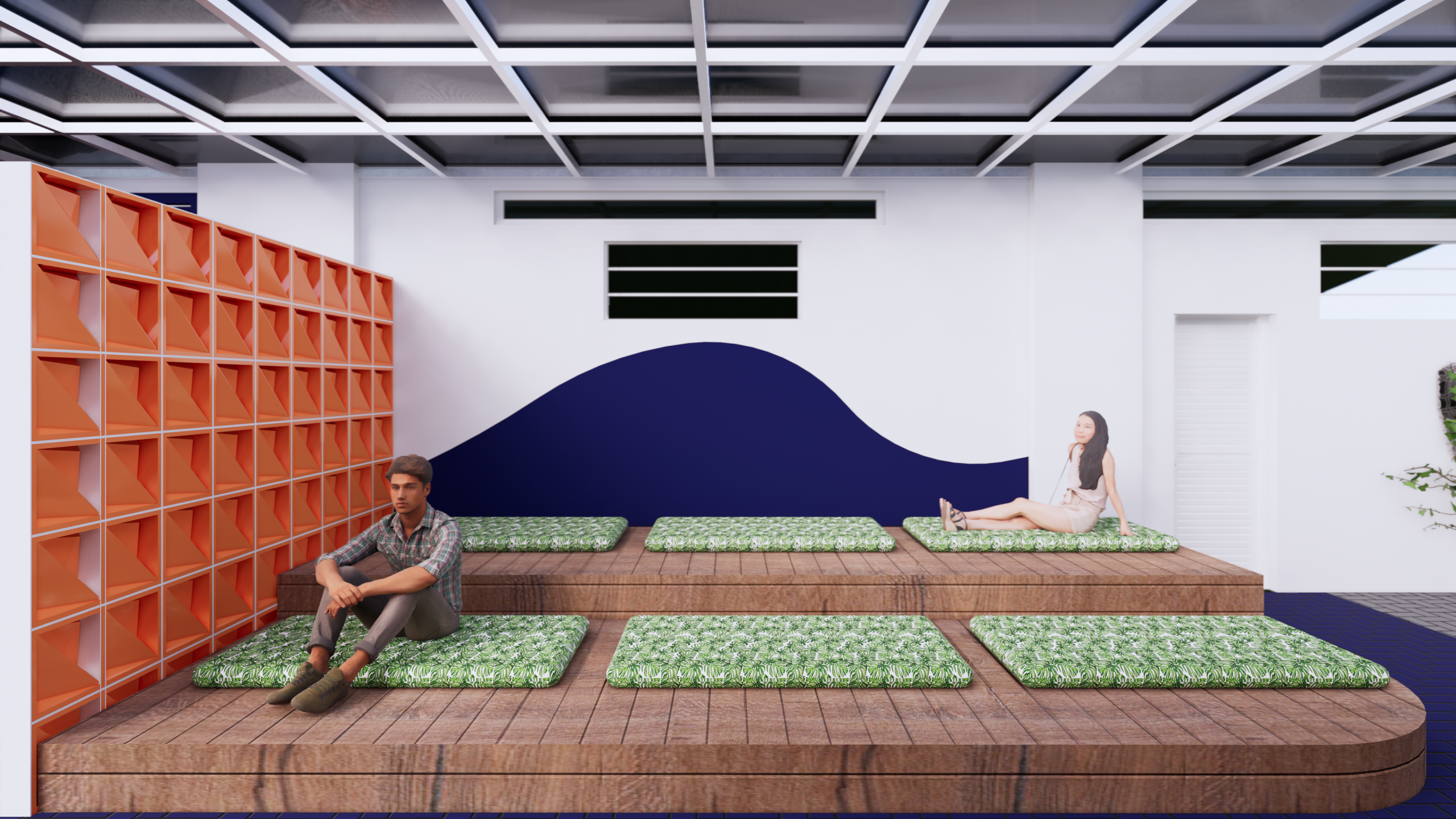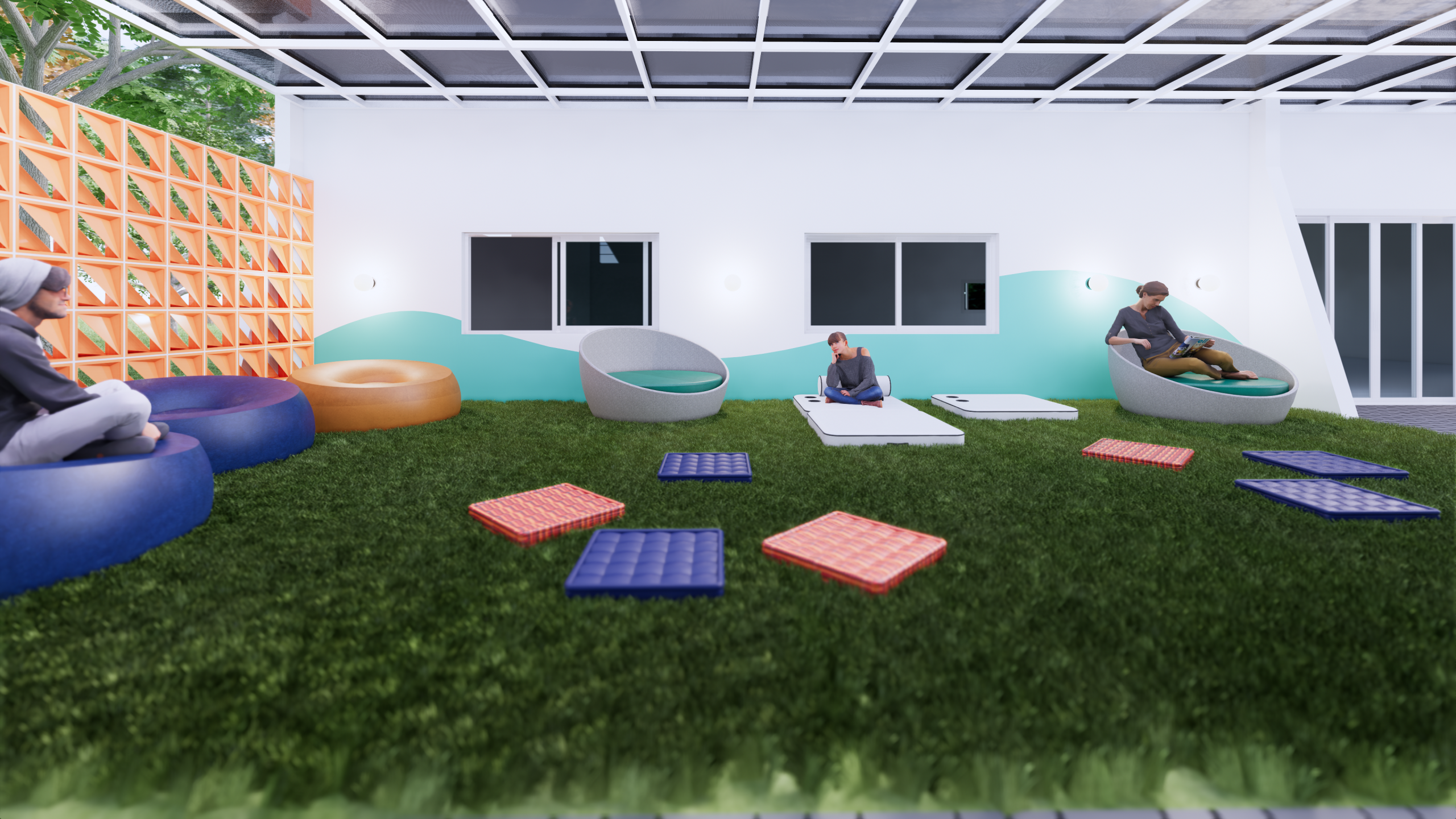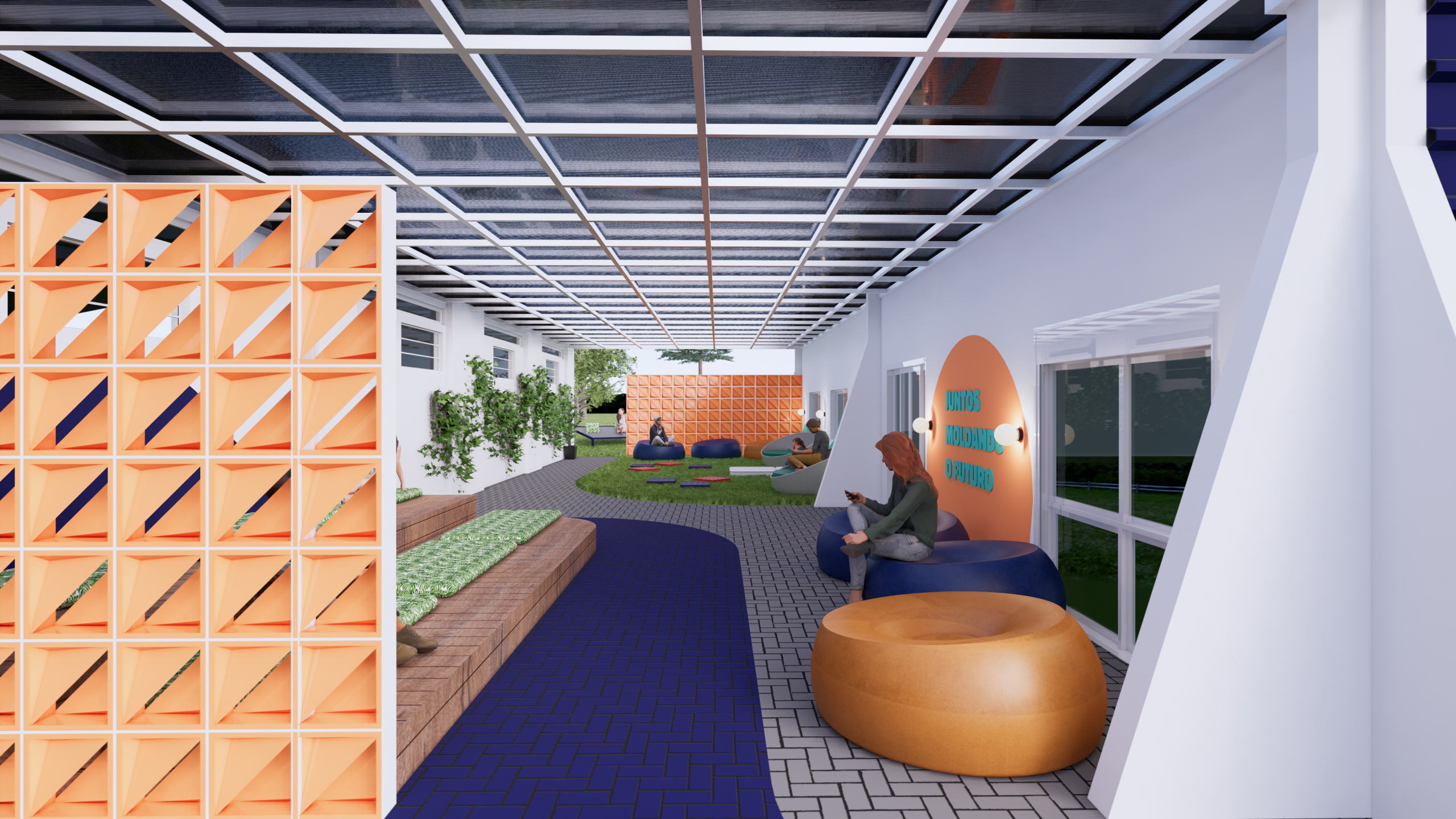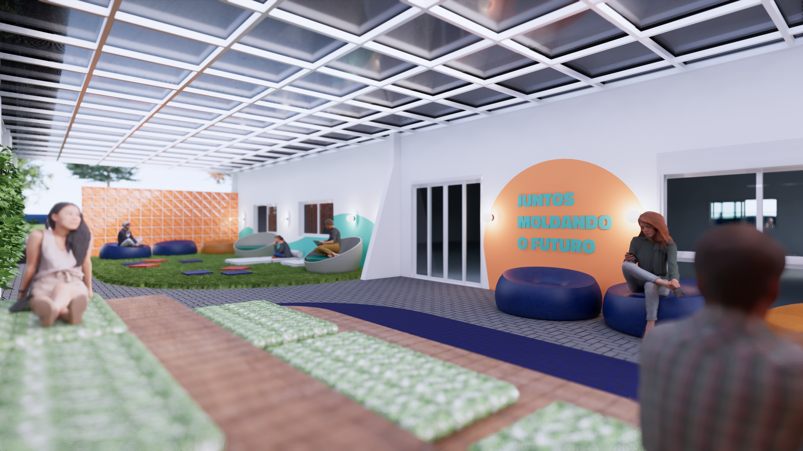 Com uma proposta dinâmica e colorida, alinhada à identidade visual da empresa, o conceito buscou transformar a área de descanso em um verdadeiro refúgio dentro do ambiente corporativo. Pufes, áreas de estar aconchegantes e coberturas estratégicas foram projetadas para oferecer conforto, leveza e acolhimento ao longo da rotina.
