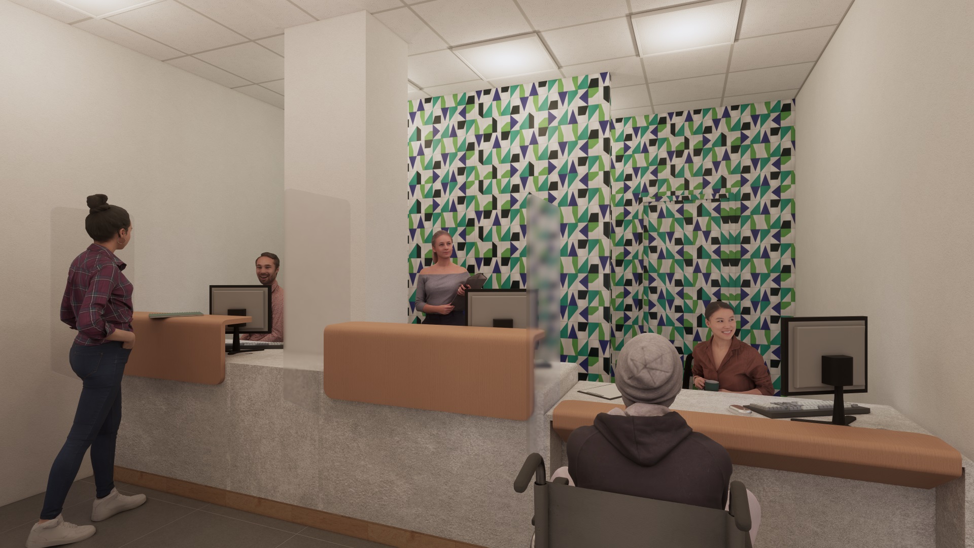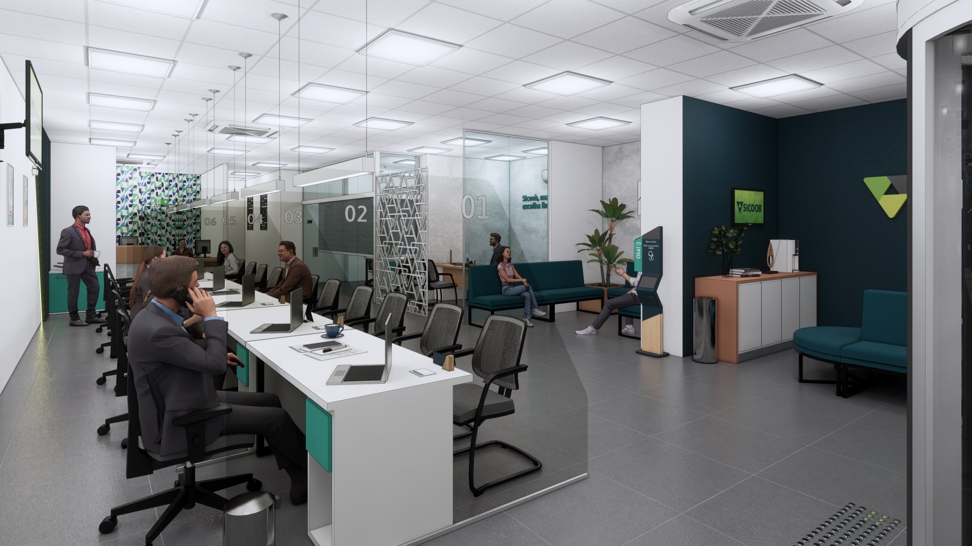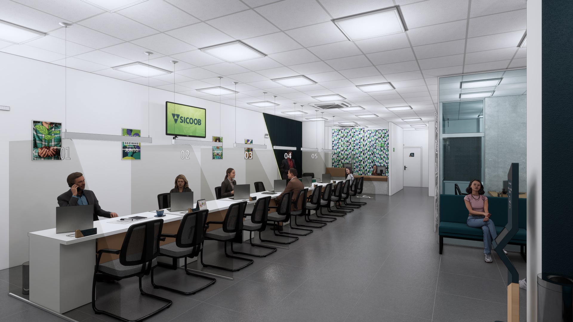 Apresentando um formato de planta irregular e com diversas reentrâncias, a distribuição dos ambientes se organizou em torno de um eixo de circulação, com estações de atendimento em uma lateral e na outra com salas fechadas e o espaço café integrado com a espera.