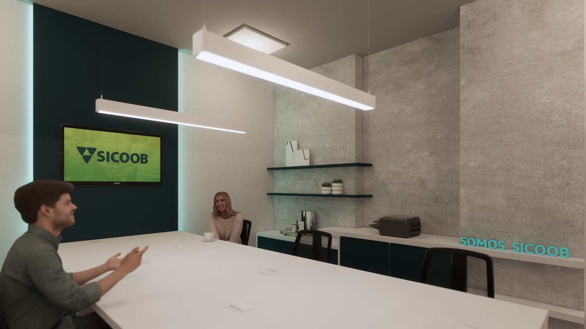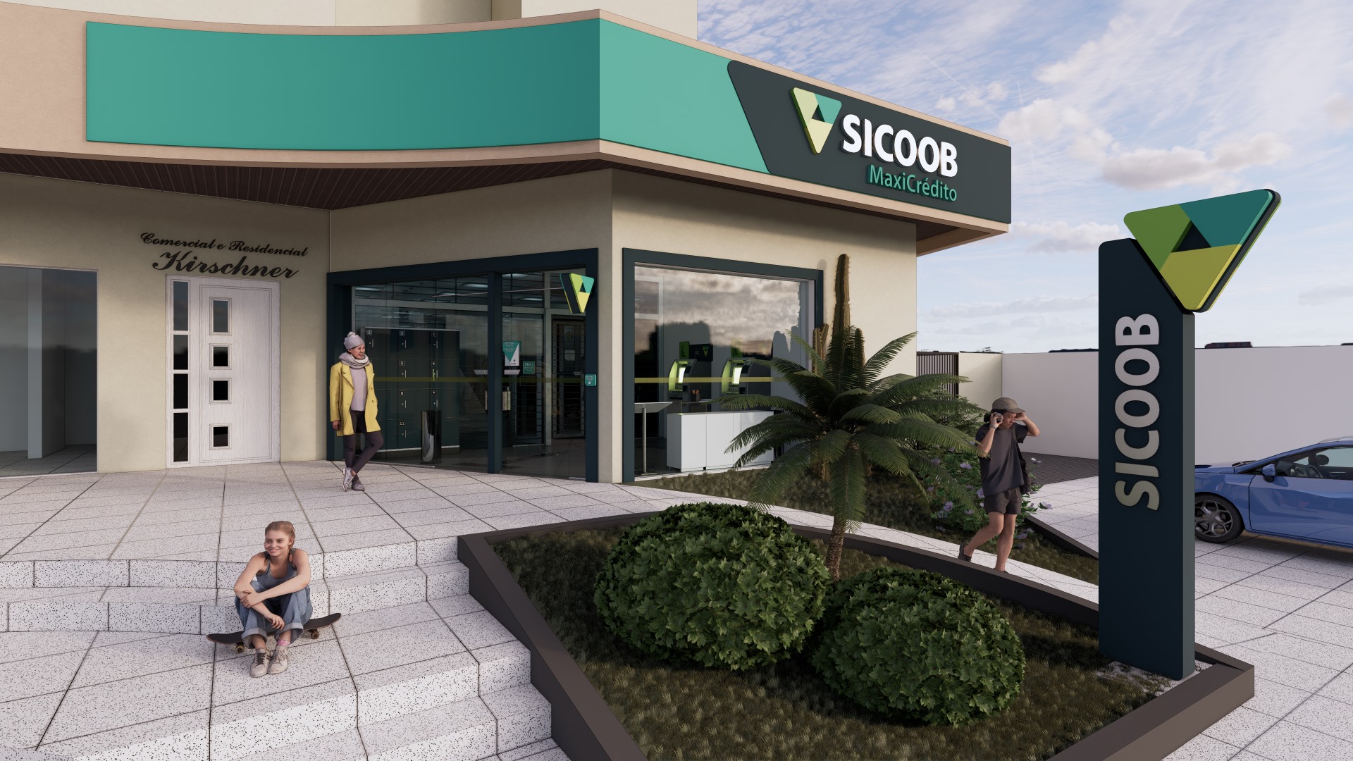 Tendo em vista uma sala comercial recuada do passeio público e com uma área delimitada para criação de identidade da fachada, a estratégia encontrada foi aplicar o Totem Iluminado da cooperativa, no espaço de jardim já existente, assim ampliando sua visualização.