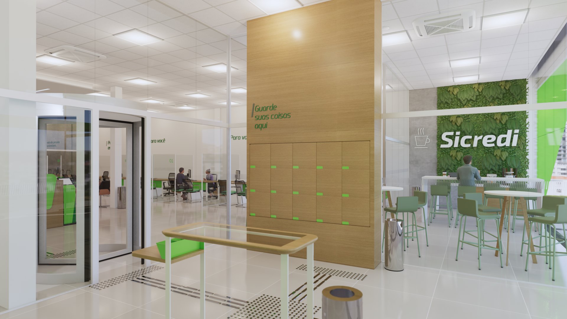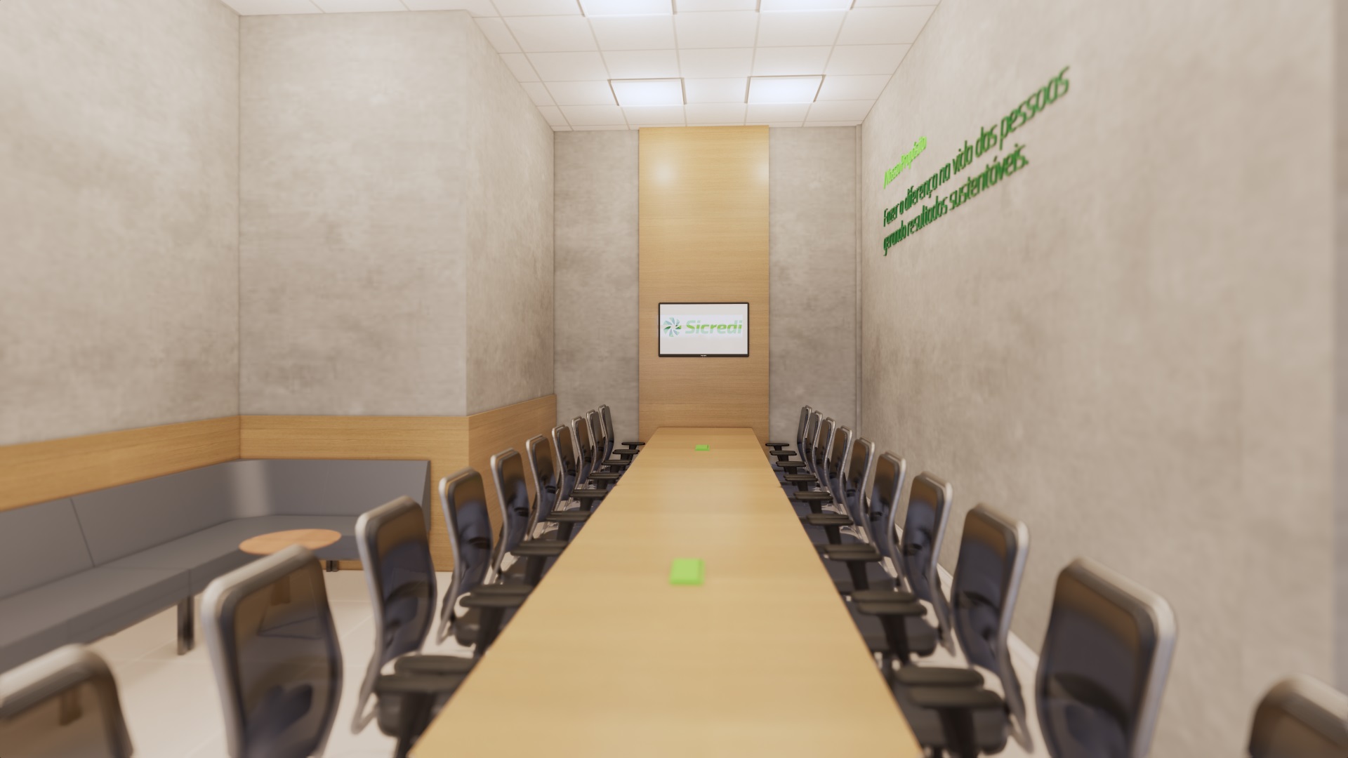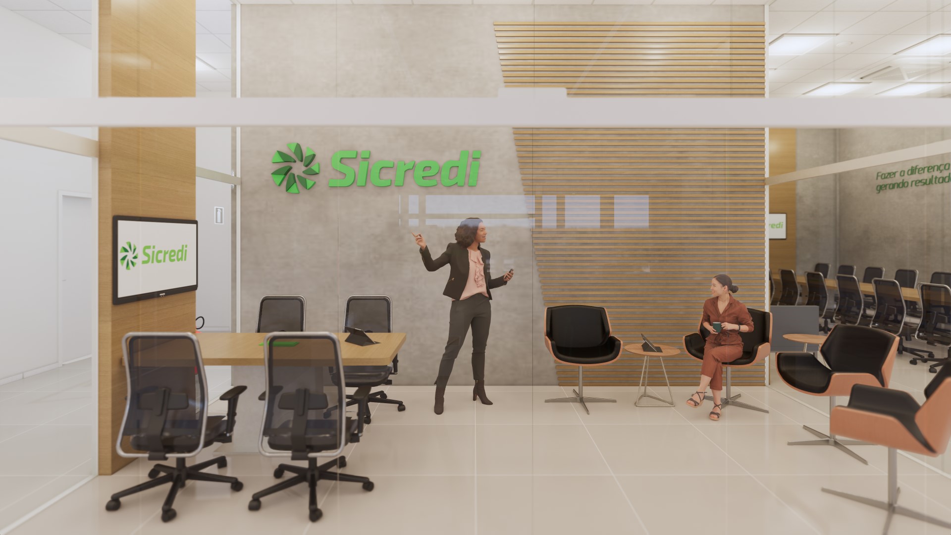 Foram planejados espaços multiusos tanto para a comunidade, quanto para o colaborador, permitindo uma maior flexibilização de atividades que podem acontecer neles, são salas que cumprem função de reunião, atendimento, conversas informais e ainda podem se conectar com outras áreas e se moldar a necessidade.