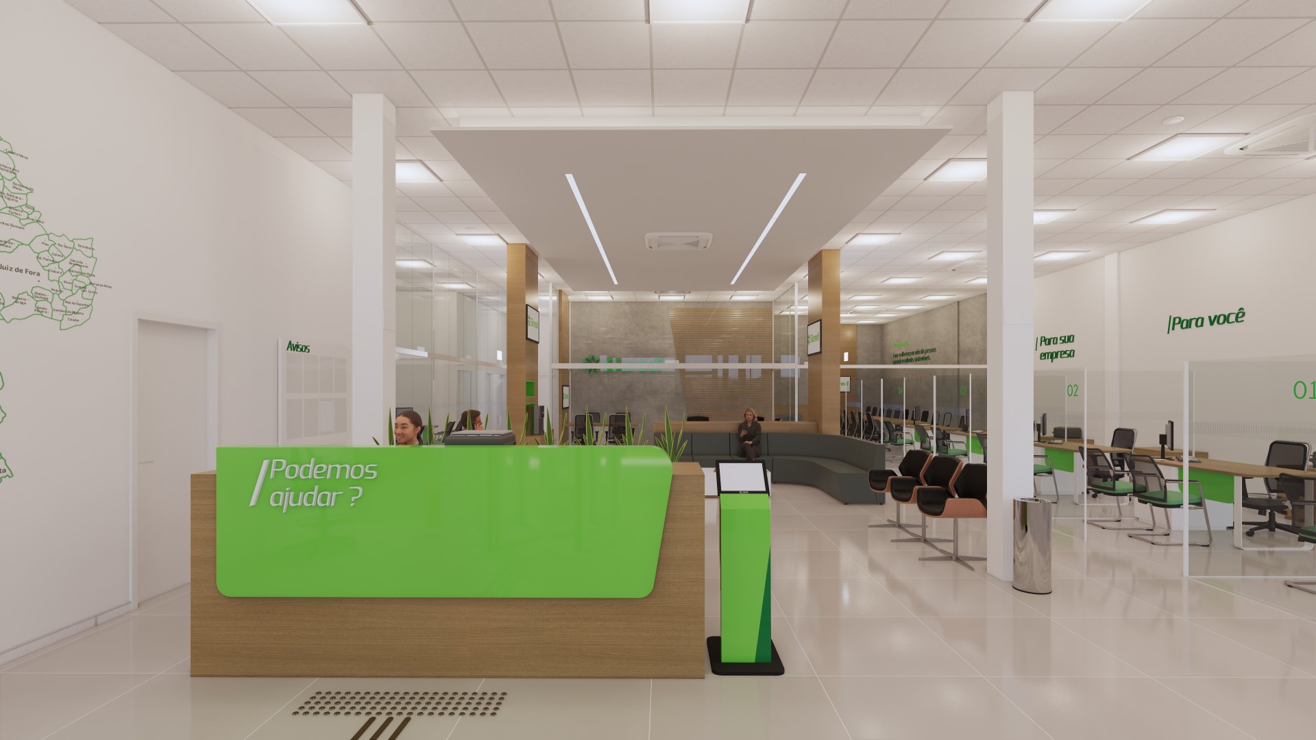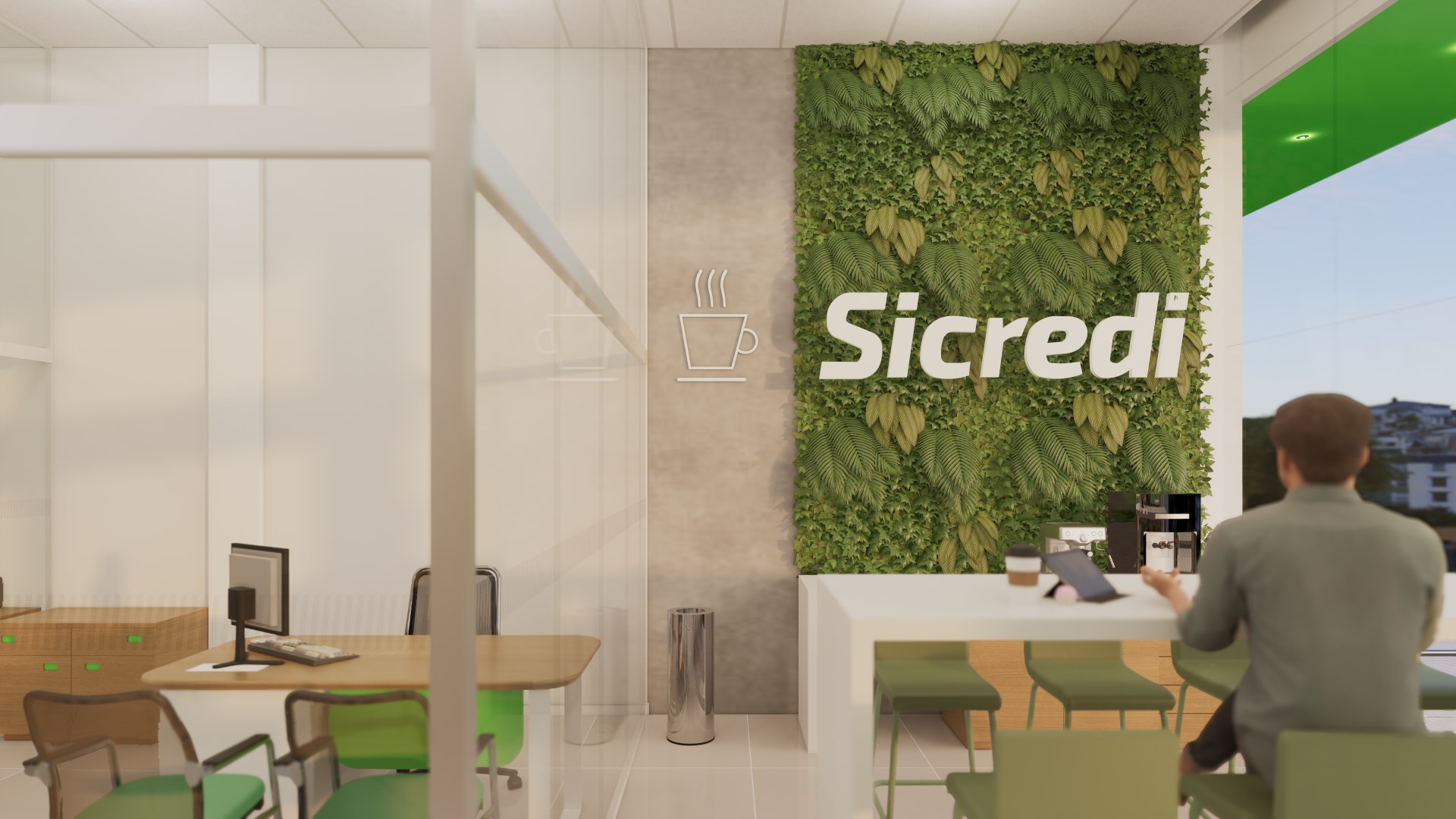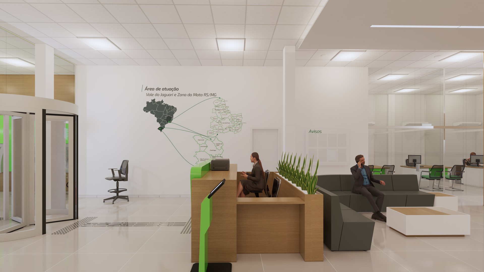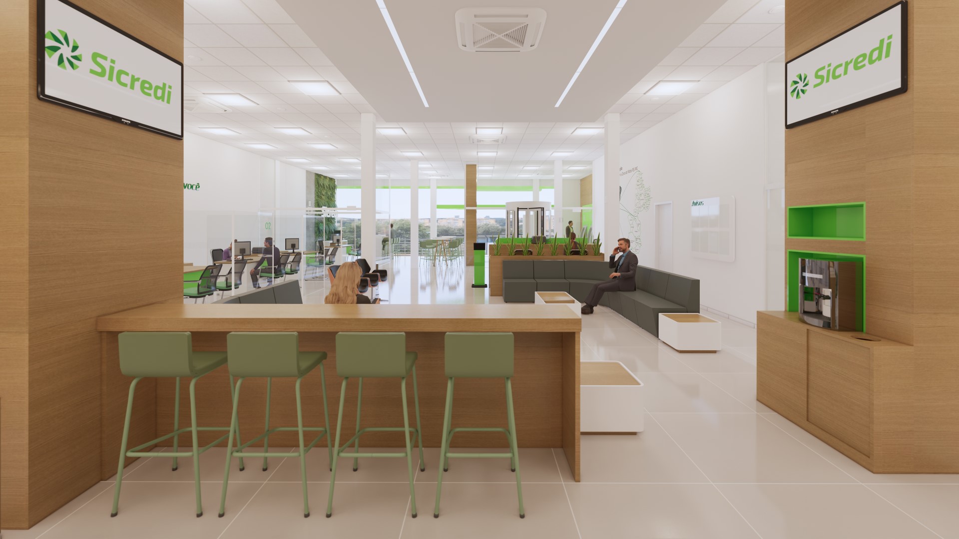 Foram planejados espaços multiusos tanto para a comunidade, quanto para o colaborador, permitindo uma maior flexibilização de atividades que podem acontecer neles, são salas que cumprem função de reunião, atendimento, conversas informais e ainda podem se conectar com outras áreas e se moldar a necessidade.