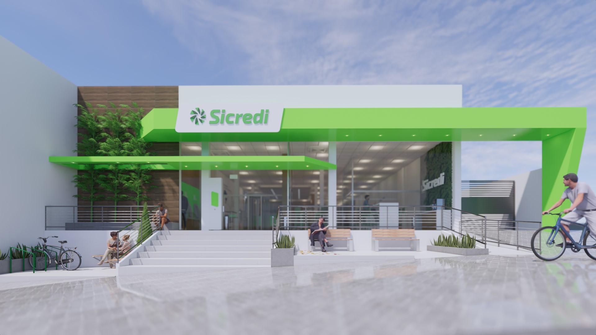 Jaguari foi um projeto imponente e grandioso que transmite a robustez da marca Sicredi na região. Com quase 500 m² de área interna, um grande programa de necessidades e o desejo de ser um espaço convidativo à comunidade local, trouxemos elementos e ambientes que transmitissem tal.